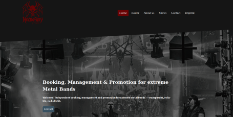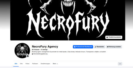 Aufbau des kompletten Erscheinungsbildes für die NecroFury Agency: Logo-Design, Gestaltung und Umsetzung der Webseite sowie Konzeption und visuelle Ausarbeitung der Social-Media-Profile auf Facebook und Instagram. Der Fokus lag auf einer klaren, eigenständigen Bildsprache mit hohem Wiedererkennungswert innerhalb der Underground-Metal-Szene.